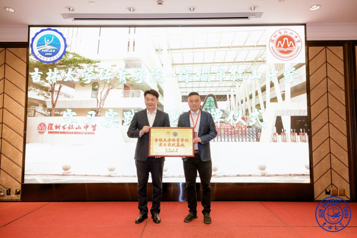 实习基地授牌仪式。院长裘鹏代表学院向深圳市红山中学授予实习基地牌匾,标志着双方在体育教育实践与人才培养方面建立起正式合作关系,为学院学子融入大湾区基础教育一线搭建又一重要平台。