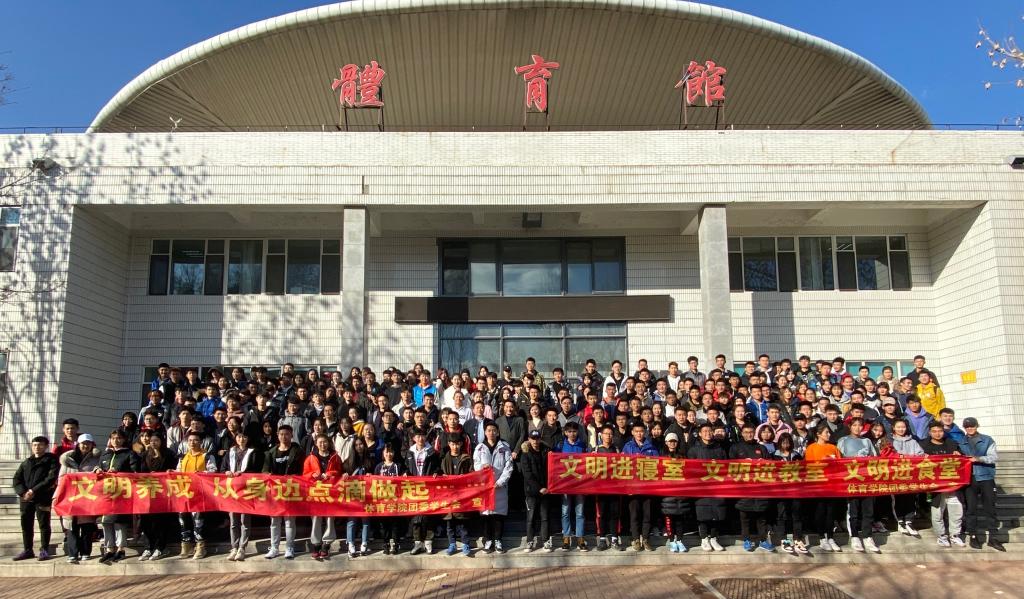 的学生必须要有规矩意识,也要讲文明行为,既要抓学习,也要强素质,做一个综合发展的体育人。裘院长还结合学院实际和未来的发展前景就学生面向国际化培养交流方面的问题给大家做了介绍和指导。最后,全体人员在宣传条幅上庄重签字,以表对自己、对学院和学校的文明承诺。之后,全体人员在体育馆门口合影留念。